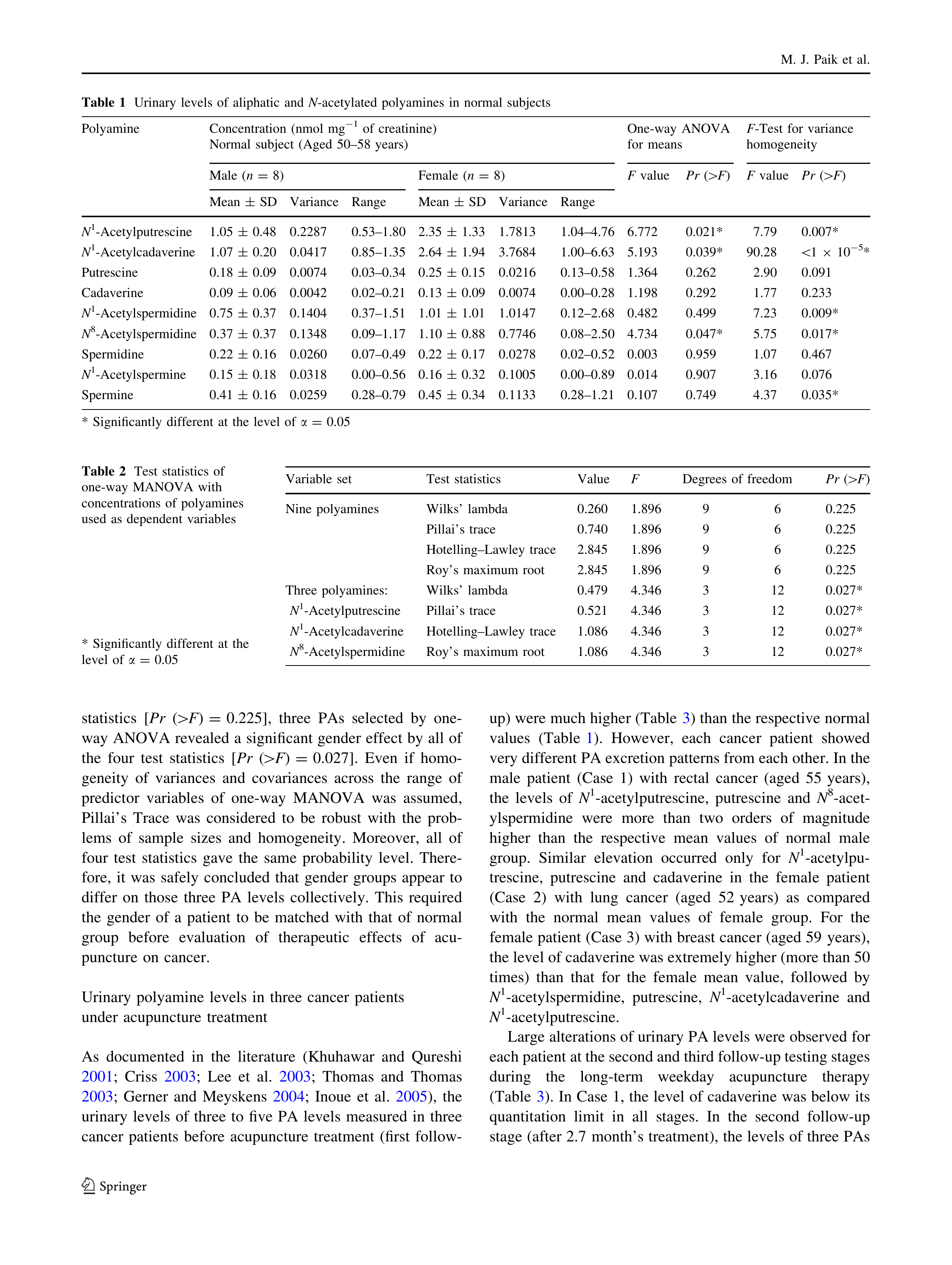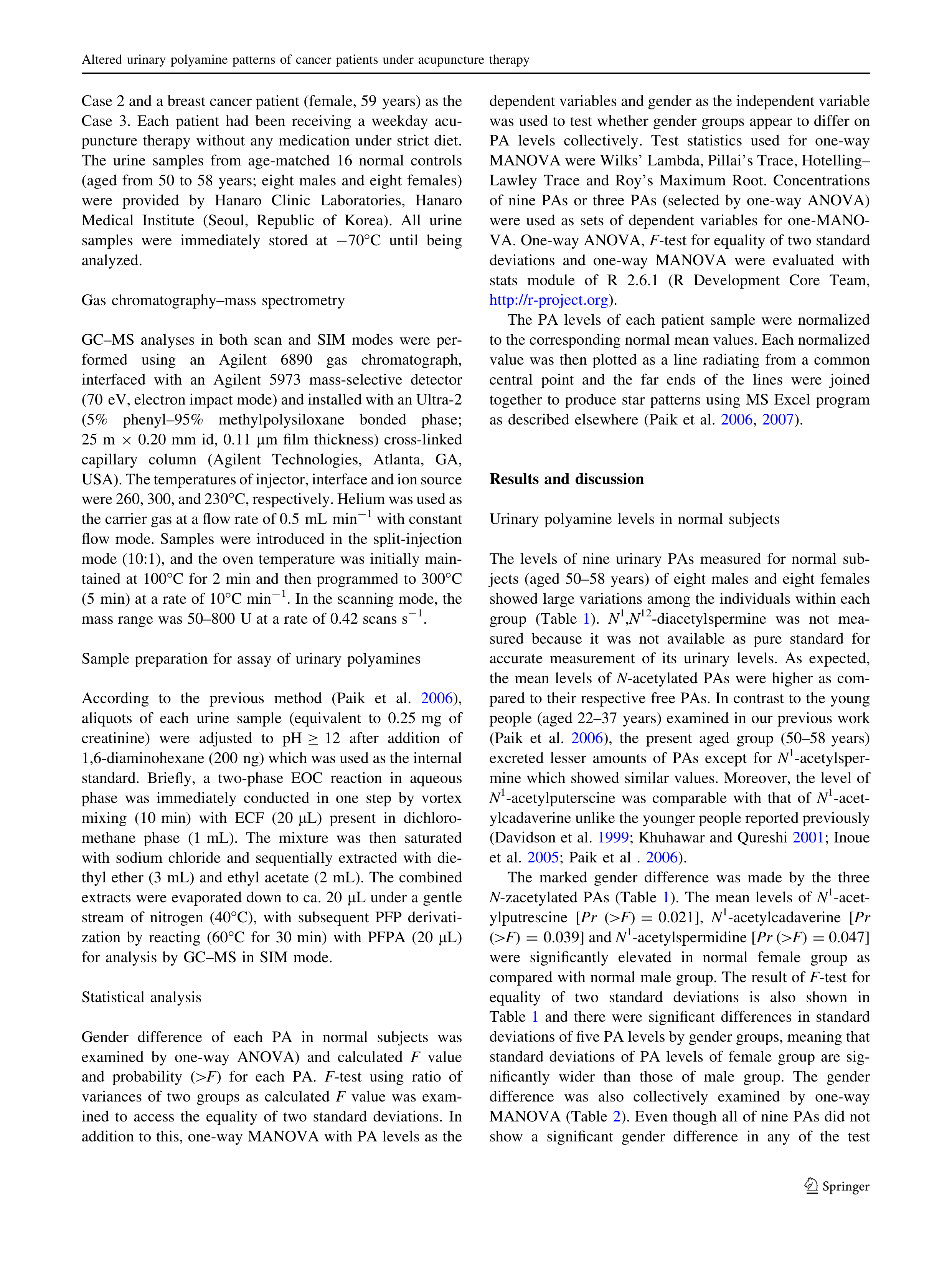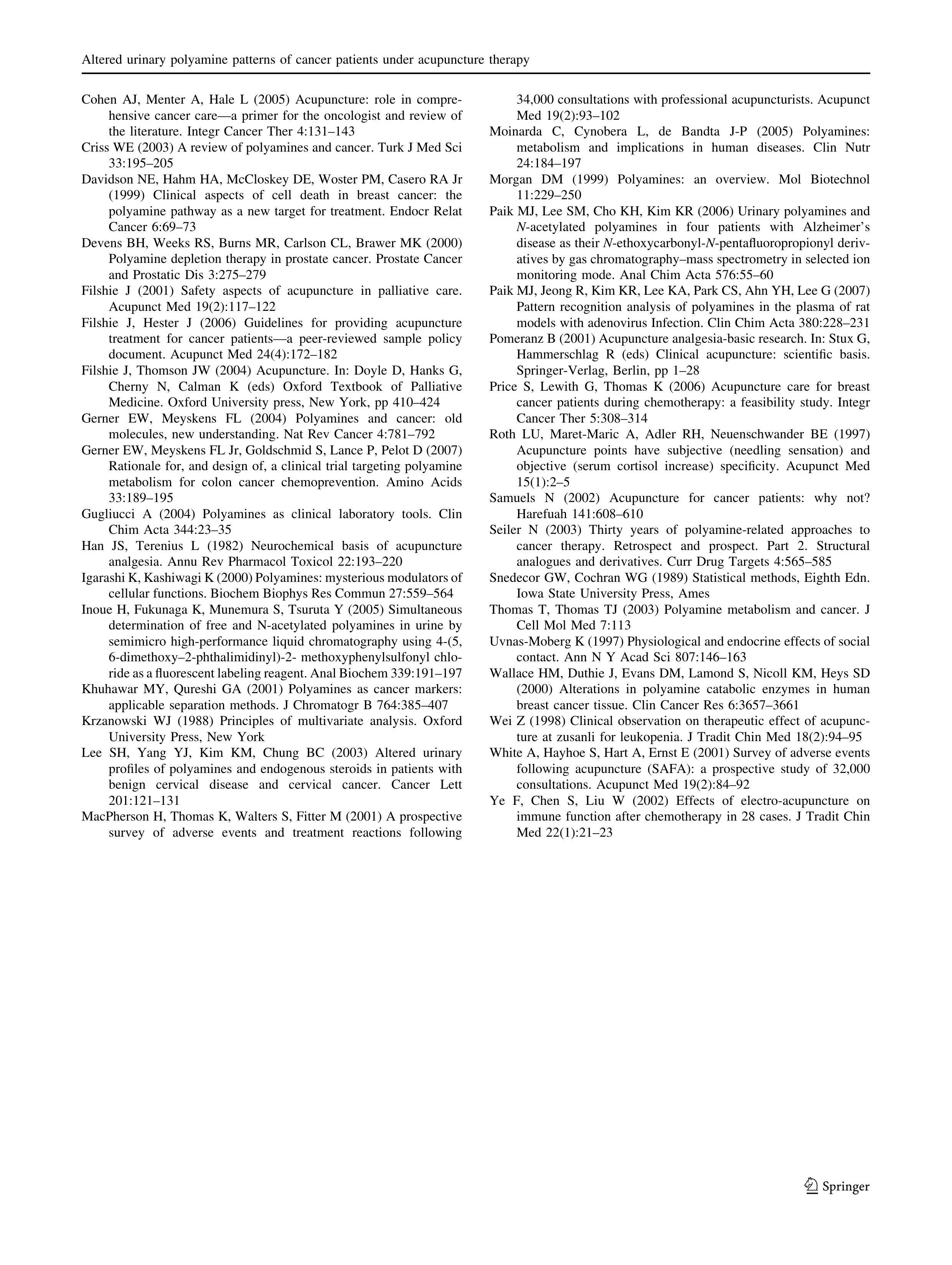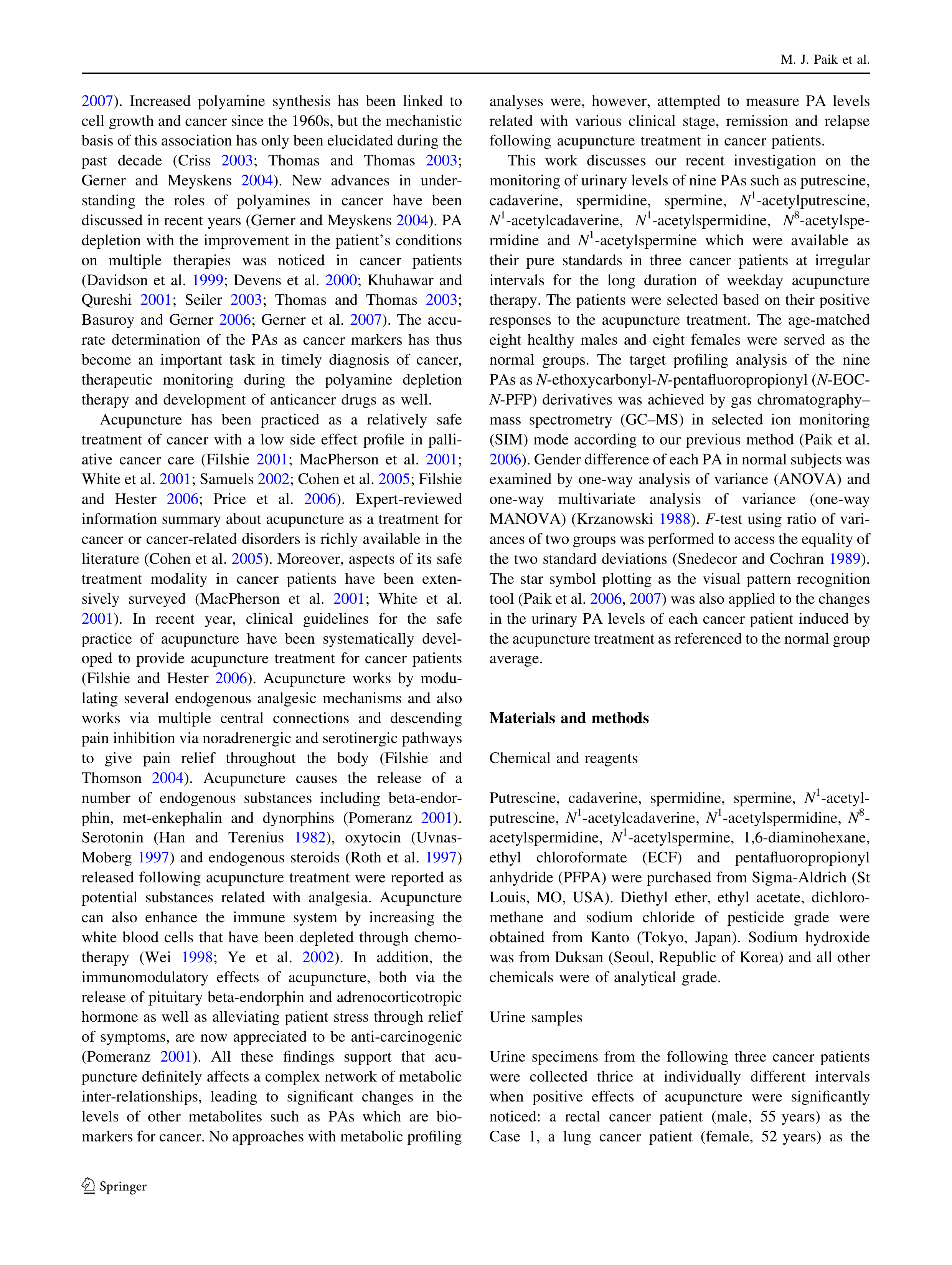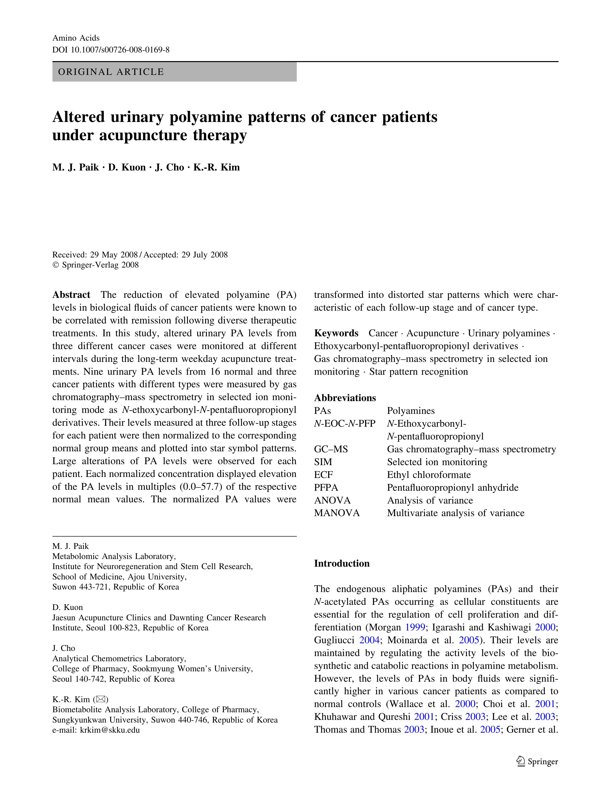 M. J. Paik, D. Kuon, J. Cho, K.-R. Kim. Altered urinary polyamine patterns of cancer patients under acupuncture therapy. Amino Acids. Volume 37, Number 2, 407-413.
